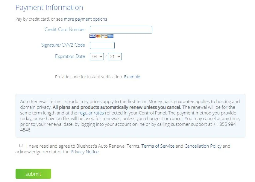 - After entering your payment information, make sure to accept the terms of service by checking the box and hit ‘Submit’.